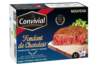 The CHAROLAIS BEEF PARFAIT is made from specially selected cuts of beef, trimmed, with all fat removed, and then cut into ultra-fine slices which are assembled into a disc shaped mould. Because of CONVIVIAL's exclusive process, the muscle cells remain intact and provide the flavour and tenderness of the meat when cooked.