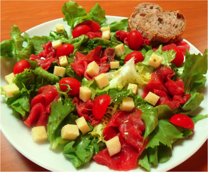 4. Prenez délicatement les fines tranches de Carpaccio et déposez-les sur la salade, à la manière d’une chiffonnade.